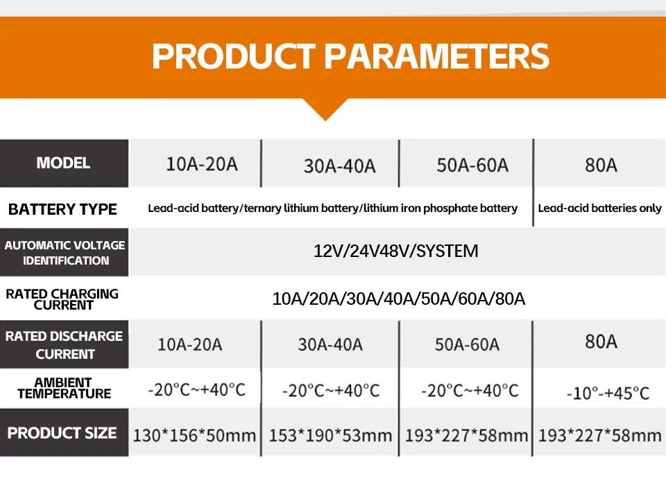 ● Seal, GEL, Flooded, LifePO4 and Li(NiCoMn)O2 charging process can be selected.
