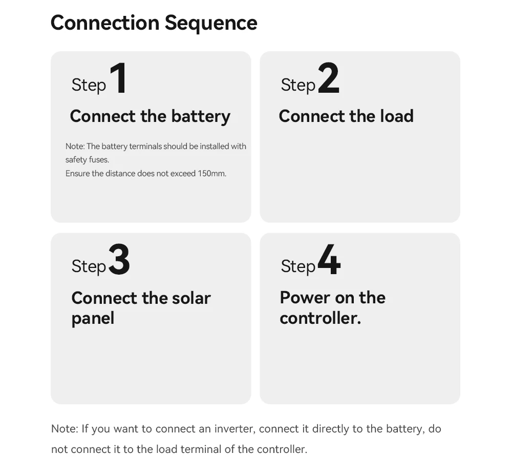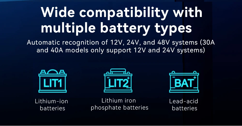 ● Seal, GEL, Flooded, LifePO4 and Li(NiCoMn)O2 charging process can be selected.