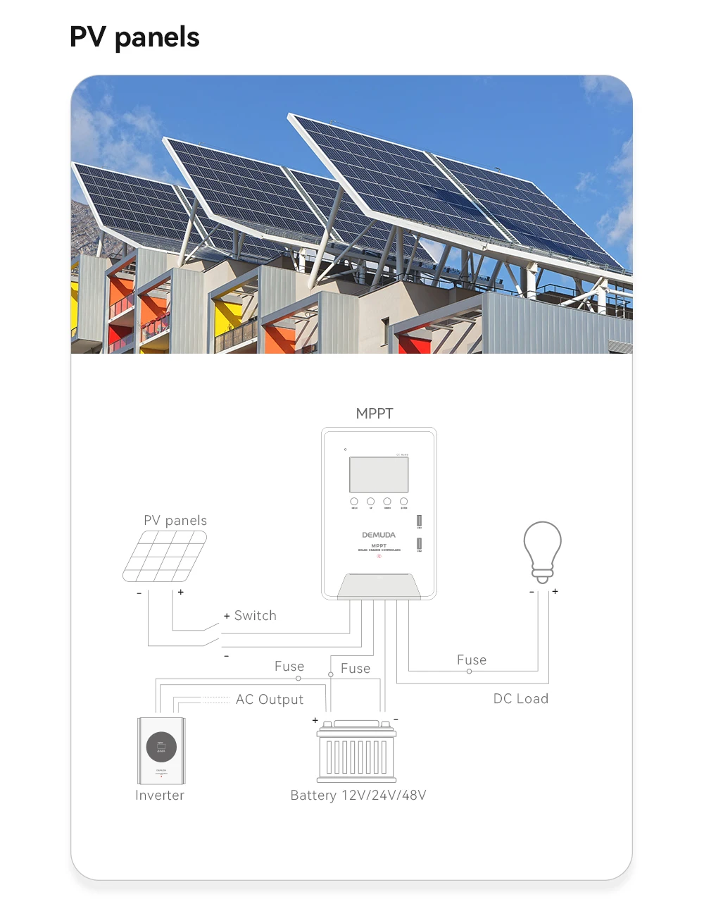 Thank you for selecting MPPT series solar charge controller with the most advanced MPPT control algorithm and the maximum power point of the pv array can be quickly tracked in any environment so that it can get the maximum energy from the solar panel and significantly improve the utilization of energy in solar system. The machine has the dual display function of LCD and Remote header (optional) and standard communication interface, convenient for user extension application and satisfy different monitoring needs to the maximum extent. It can be used in communication base station, home power supply system, traffic light, solar street lamp, courtyard lamp systems, etc.