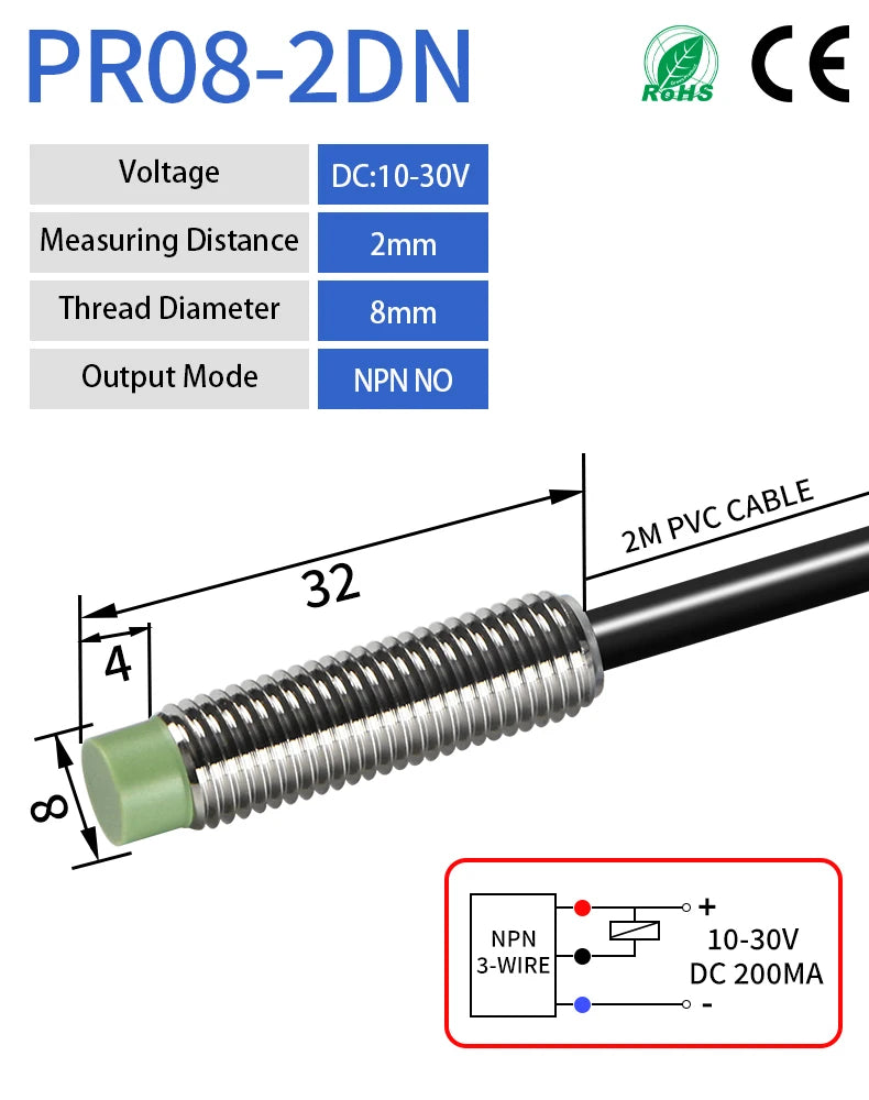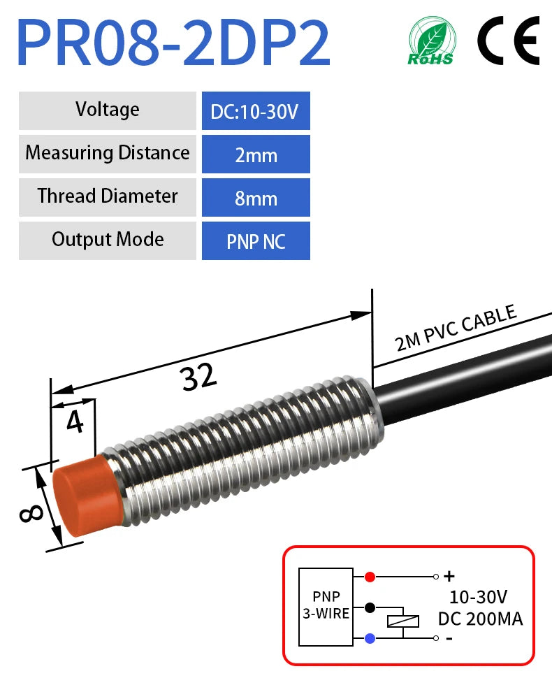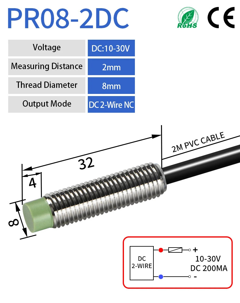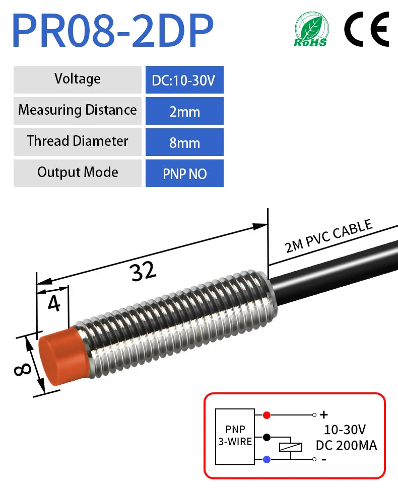 GTRIC PR08 Inductive Proximity Sensor Switch M8 Short Type 12-24V DC Non-Flush PR08-2DN PR08-2DP NPN PNP 2mm Sensing Distance