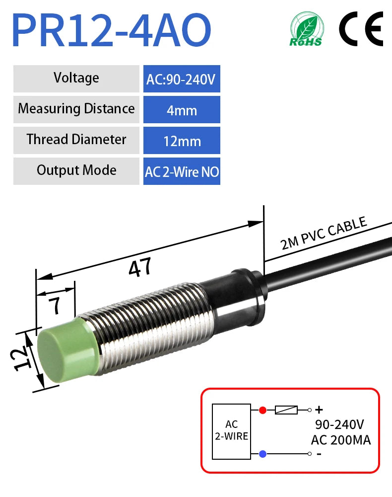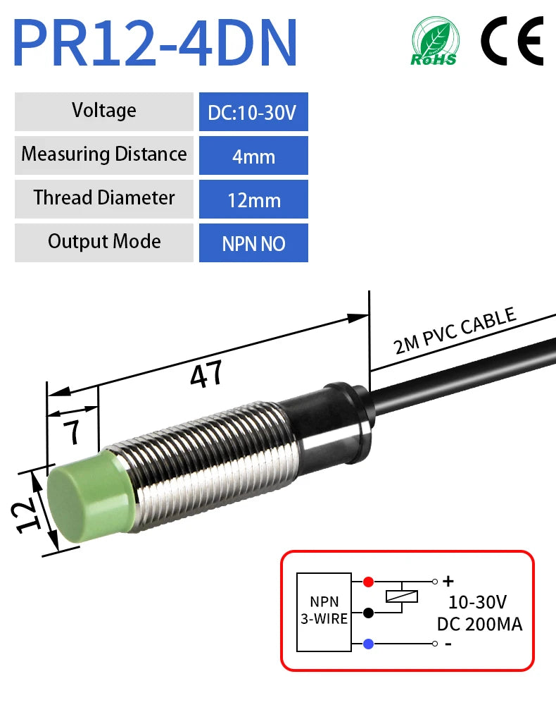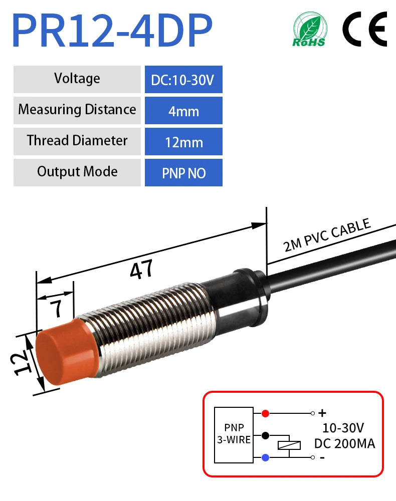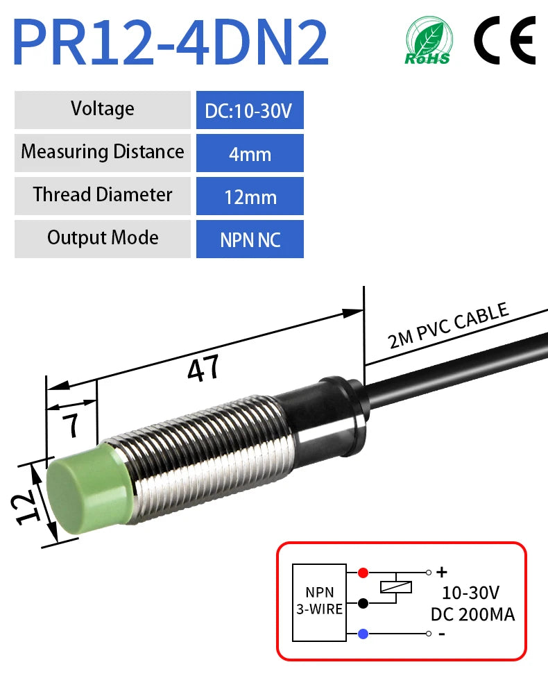 GTRIC PR12 Inductive Proximity Sensor PR12-4DN PR12-4DP M12 Short Type Proximity Switch 4MM Non-Flush 10-30V DC NPN PNP 2M Cable
